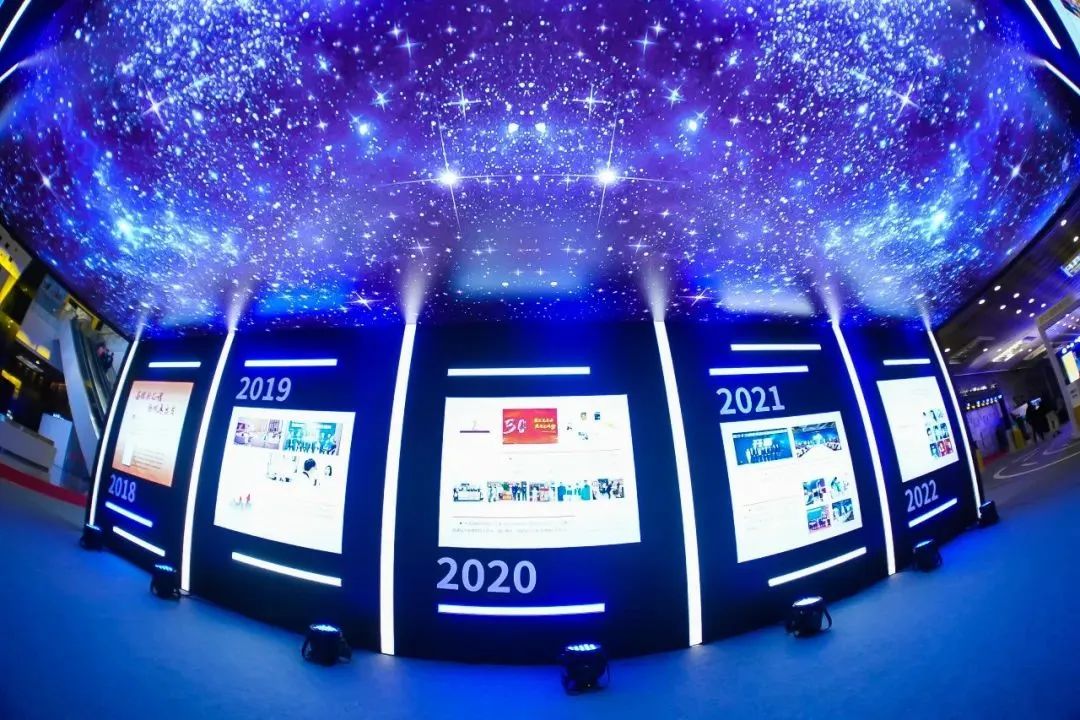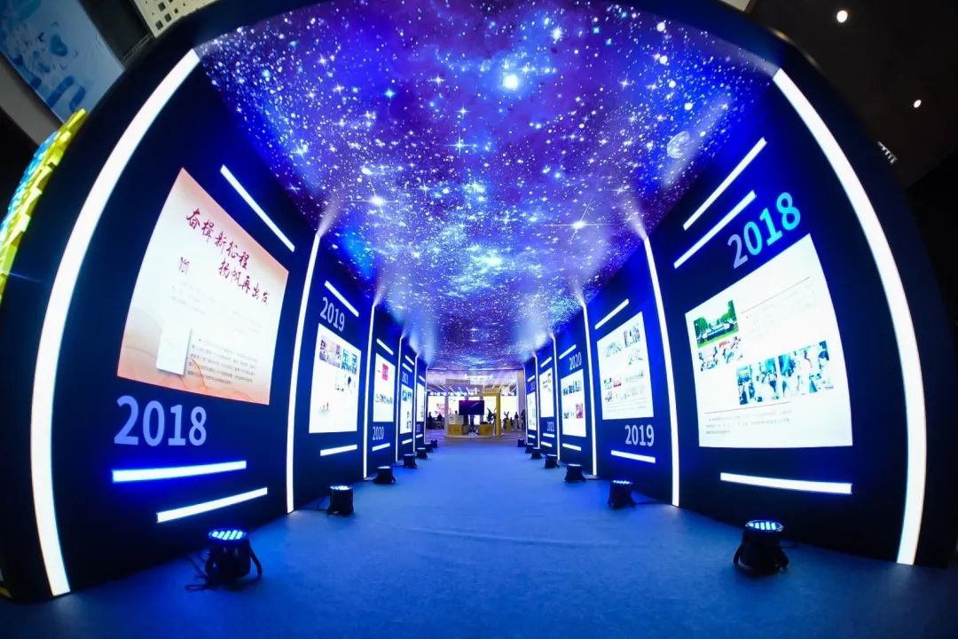 视空隧道光影展-在视空隧道内部两侧按时间顺序展示了中国眼镜行业历年大事记。底部蓝色光源照射顶部星空图案渲染出星空密布的效果,漫步其中,仿佛置身于银河隧道,给人一种沉浸式的体验。